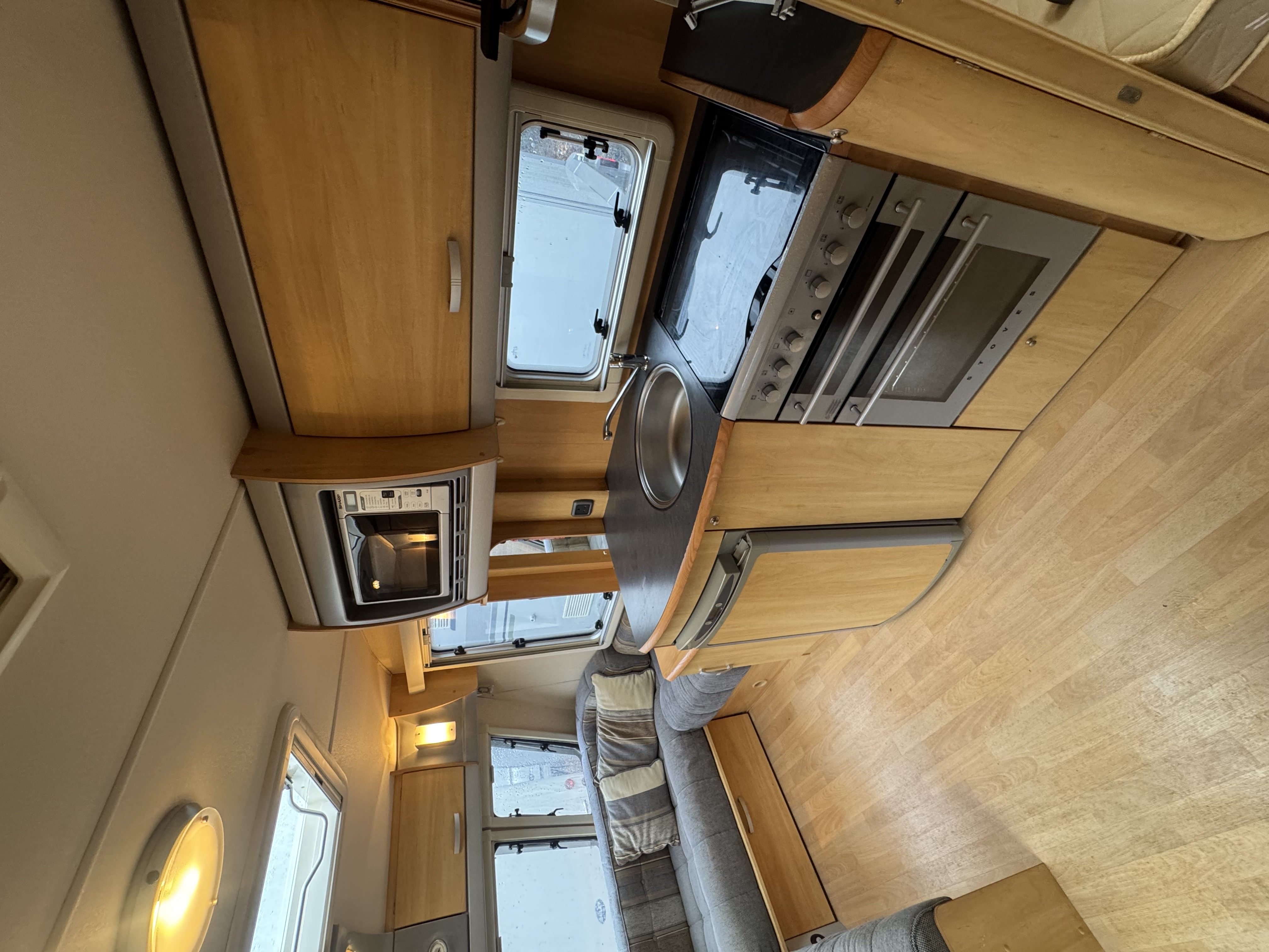 KITCHENETTE: Full cooker with oven, grill, and 4-burner hob (including electric hotplate) - Three-way Thetford fridge with freezer compartment - Microwave oven - Stainless steel sink with mixer tap - Roof-mounted Heki skylight for additional light and ventilation - Ample cupboard and drawer storage