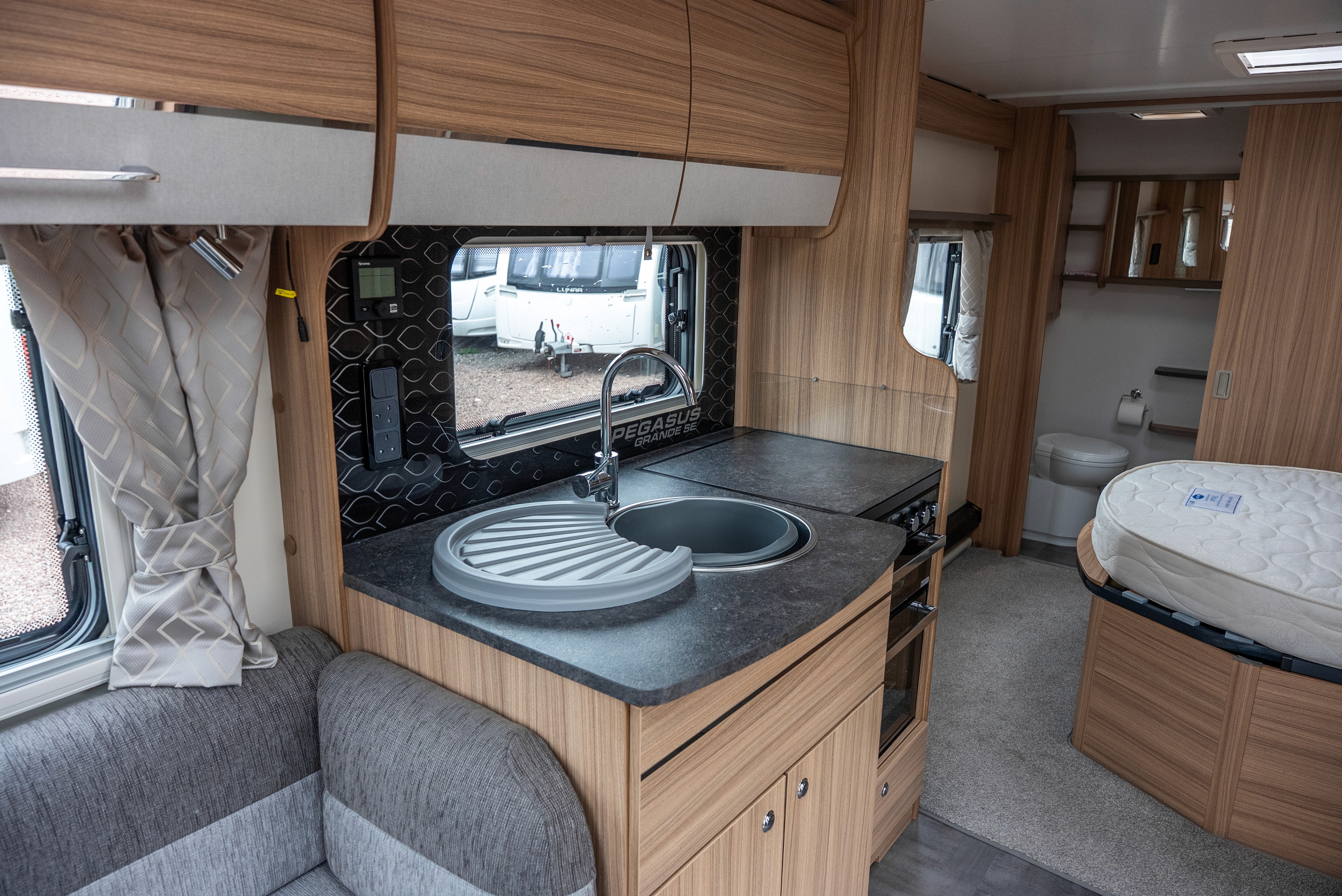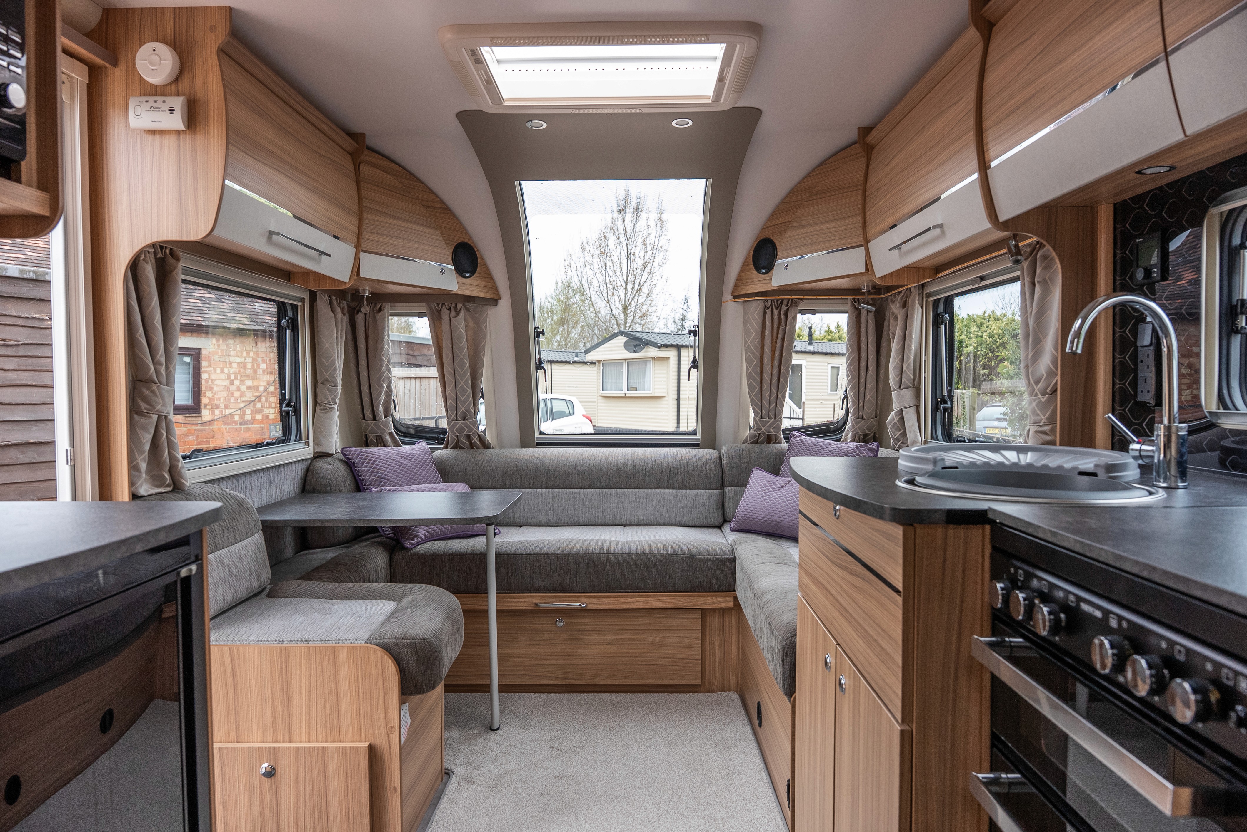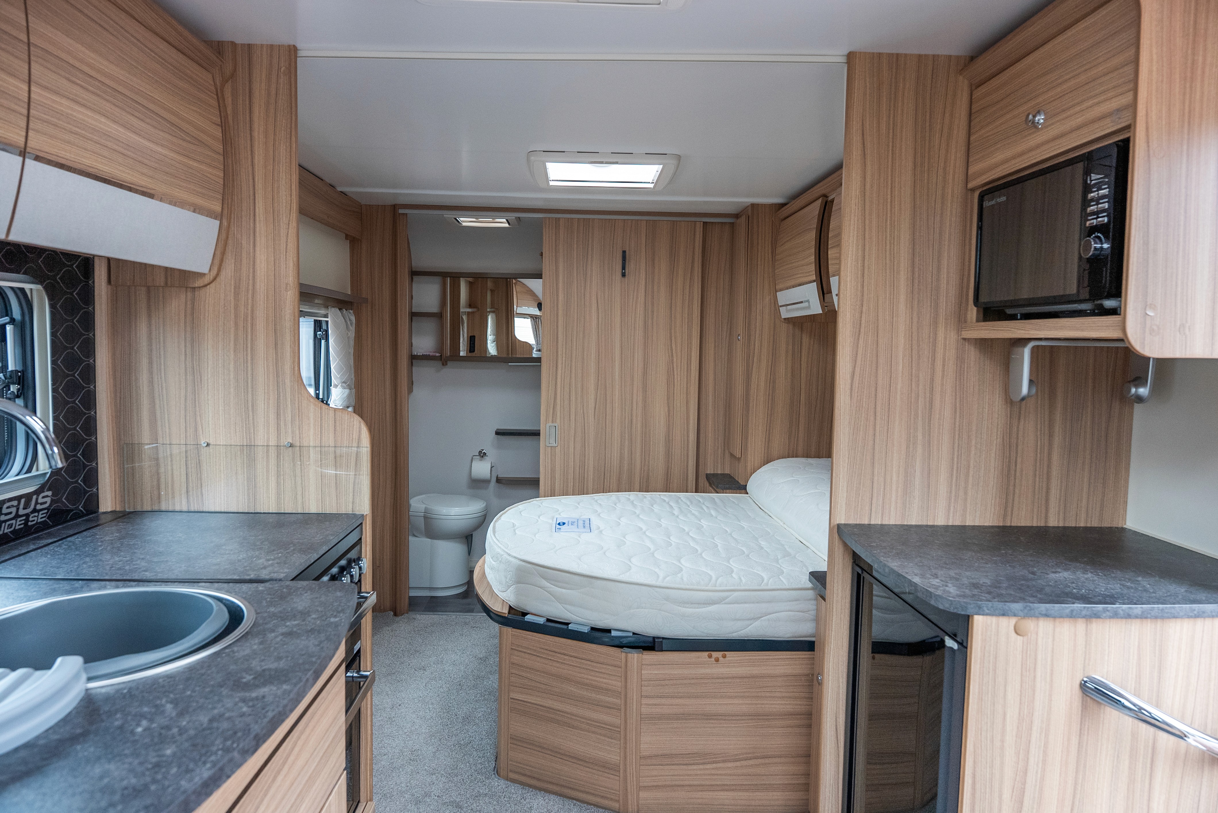 Thetford oven, grill, hob and built-in microwave - Fridge with freezer compartment - Stainless steel sink with mixer tap - Ample worktop space - Rooflight for ventilation - Plenty of cupboard and drawer storage - LED lighting throughout