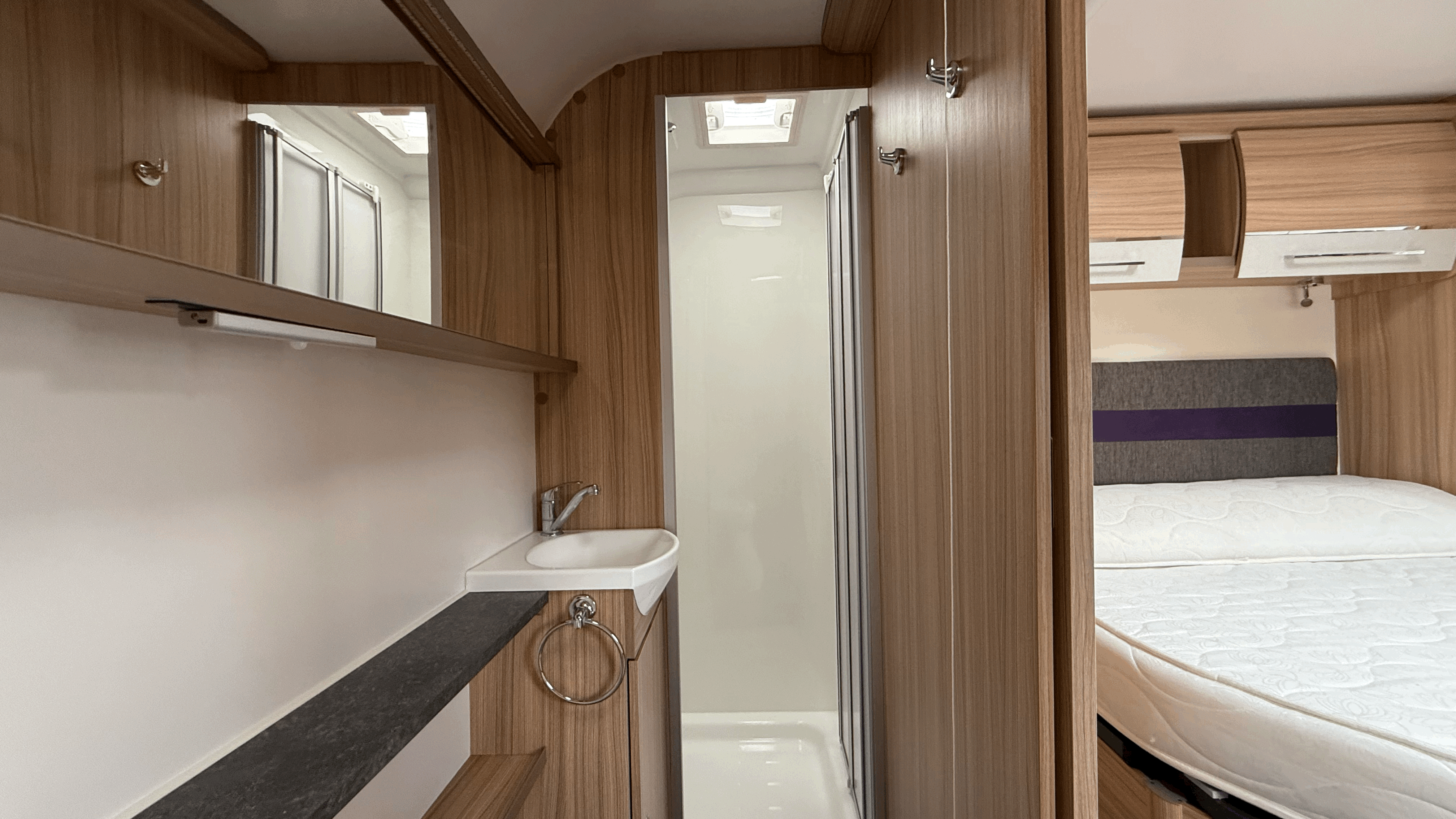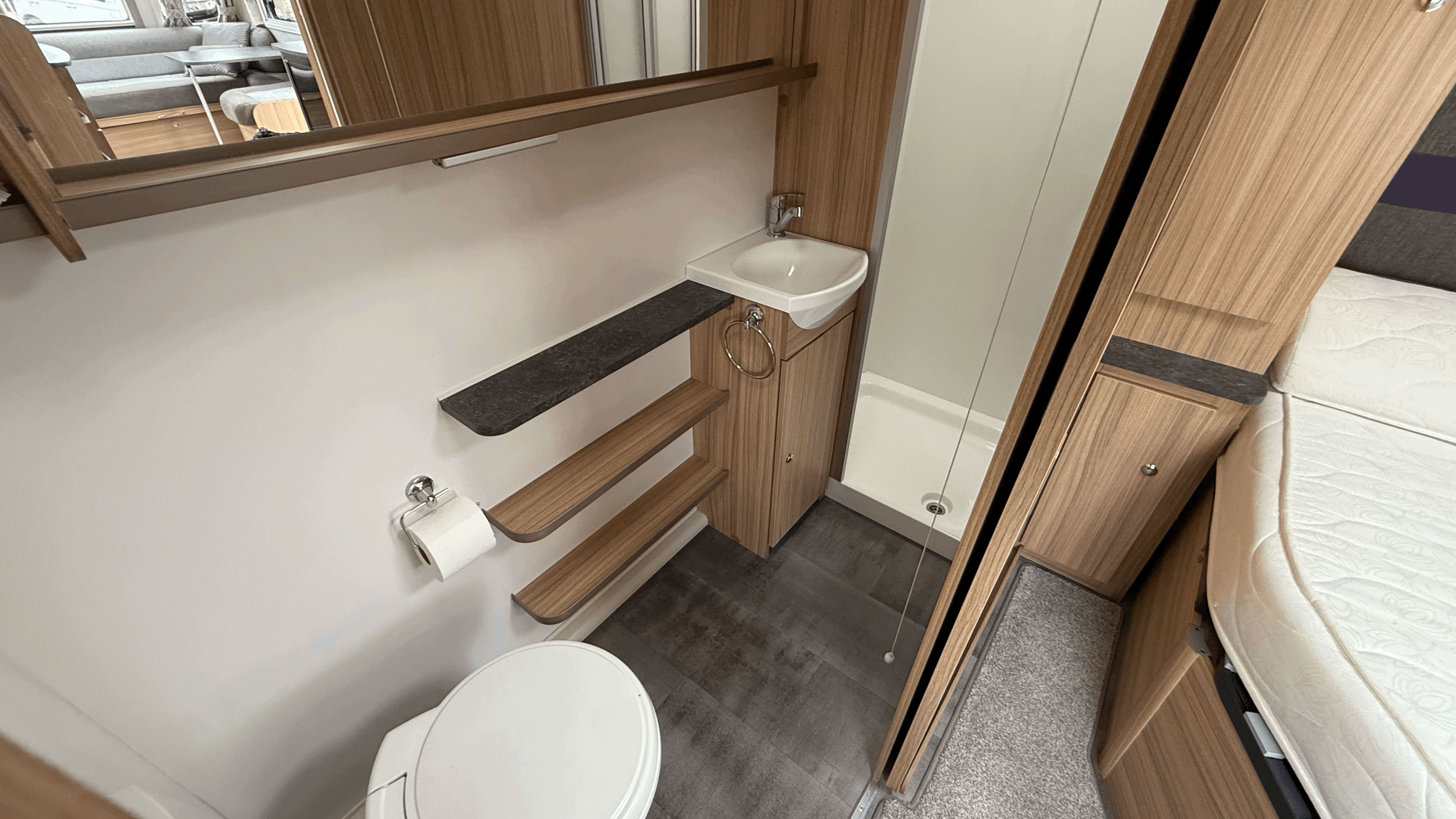 Full-width rear washroom with domestic-style door - Fully lined shower cubicle - Thetford electric flush cassette toilet - Hand basin with mixer tap and mirror - Vanity unit and storage cupboards - Roof vent for light and ventilation