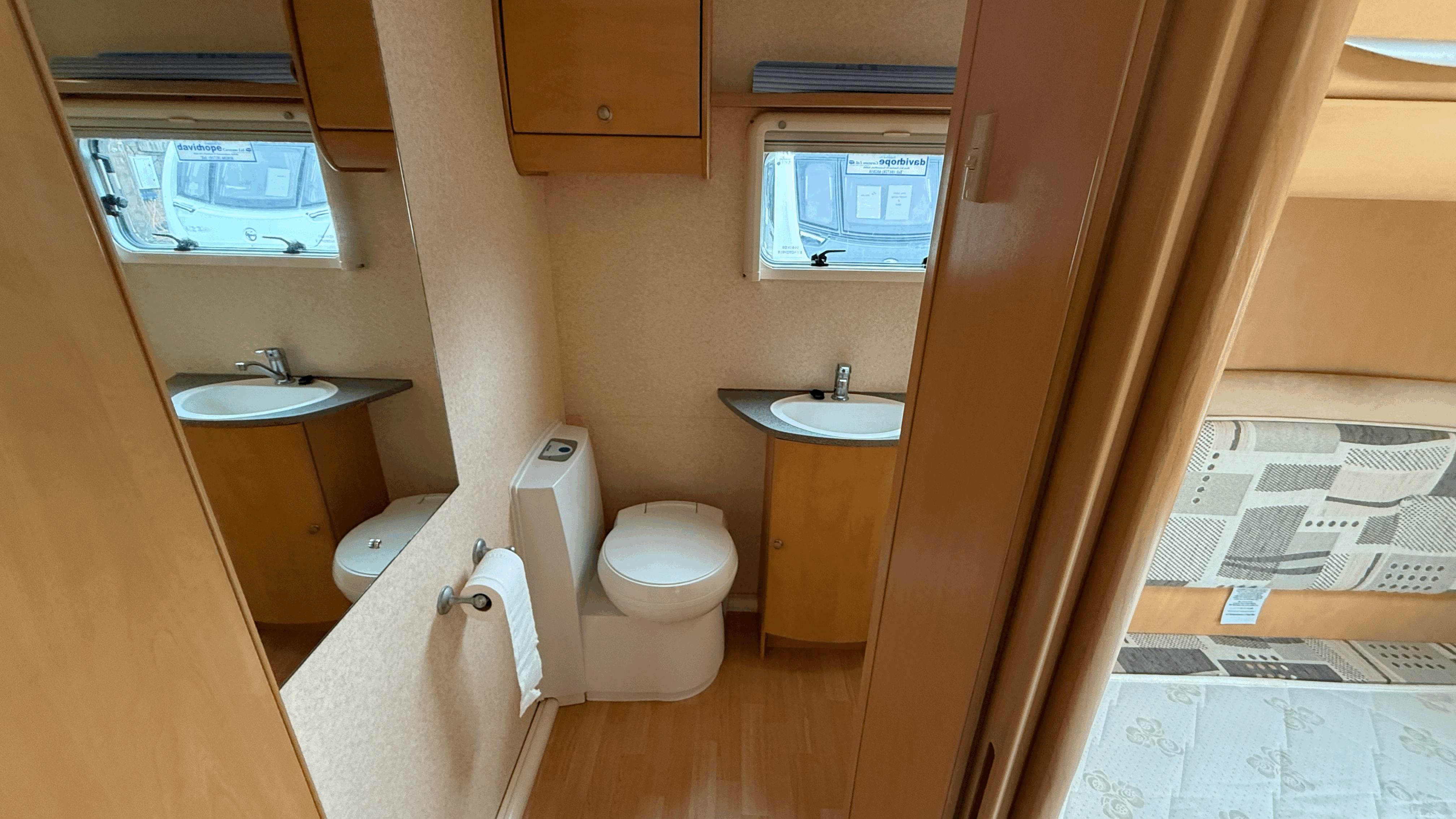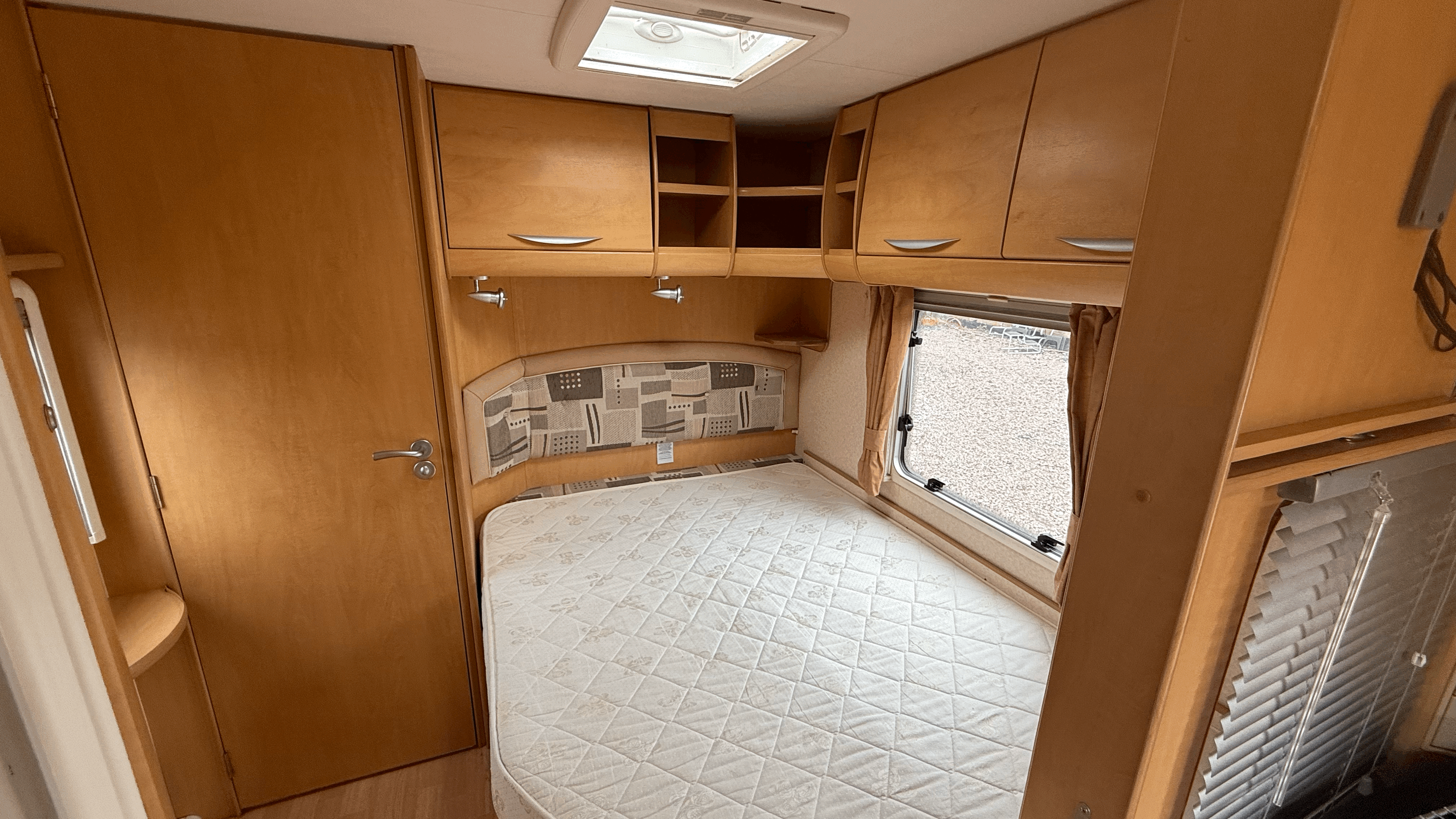 Fixed rear double bed - Lift-up storage beneath - Wardrobe storage nearby - Overhead lockers for additional storage - Privacy screen to separate sleeping area