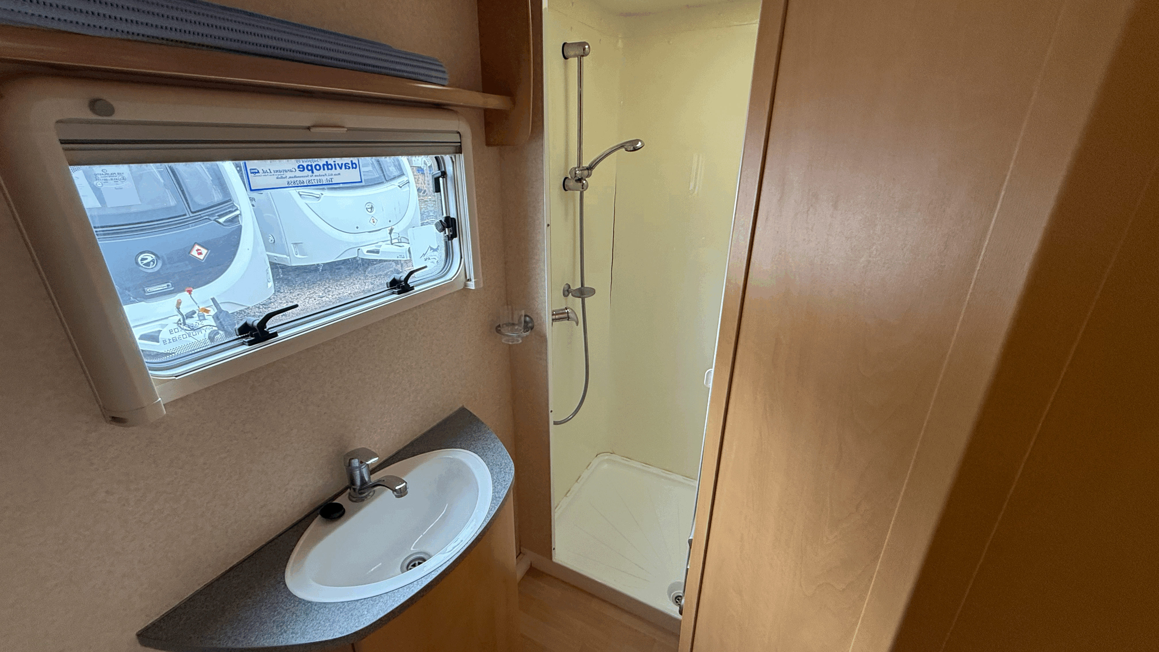 Full-width rear washroom - Separate shower cubicle - Thetford swivel cassette toilet - Hand basin with mixer tap and mirror - Vanity storage and cupboards - Roof vent for light and ventilation