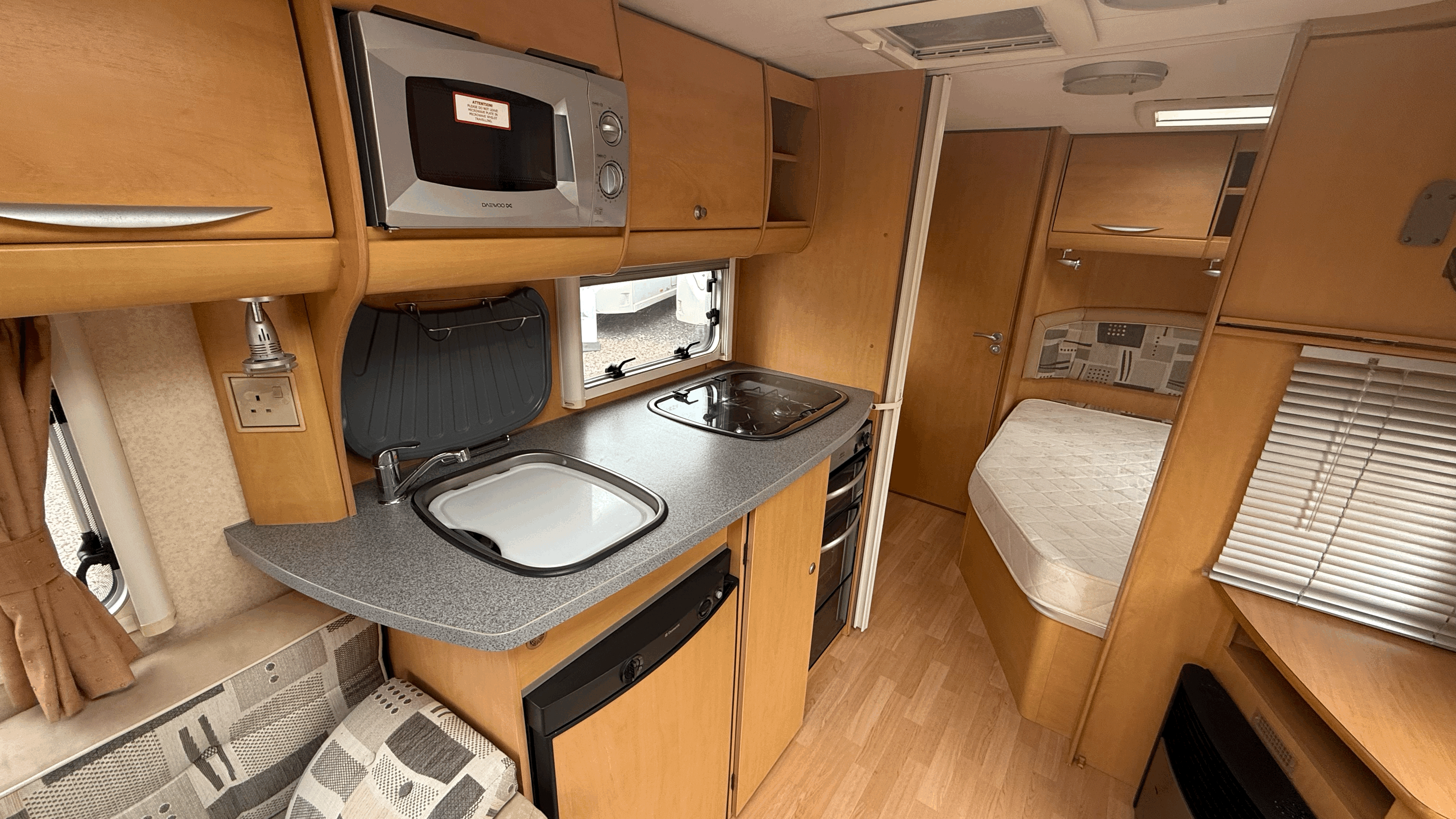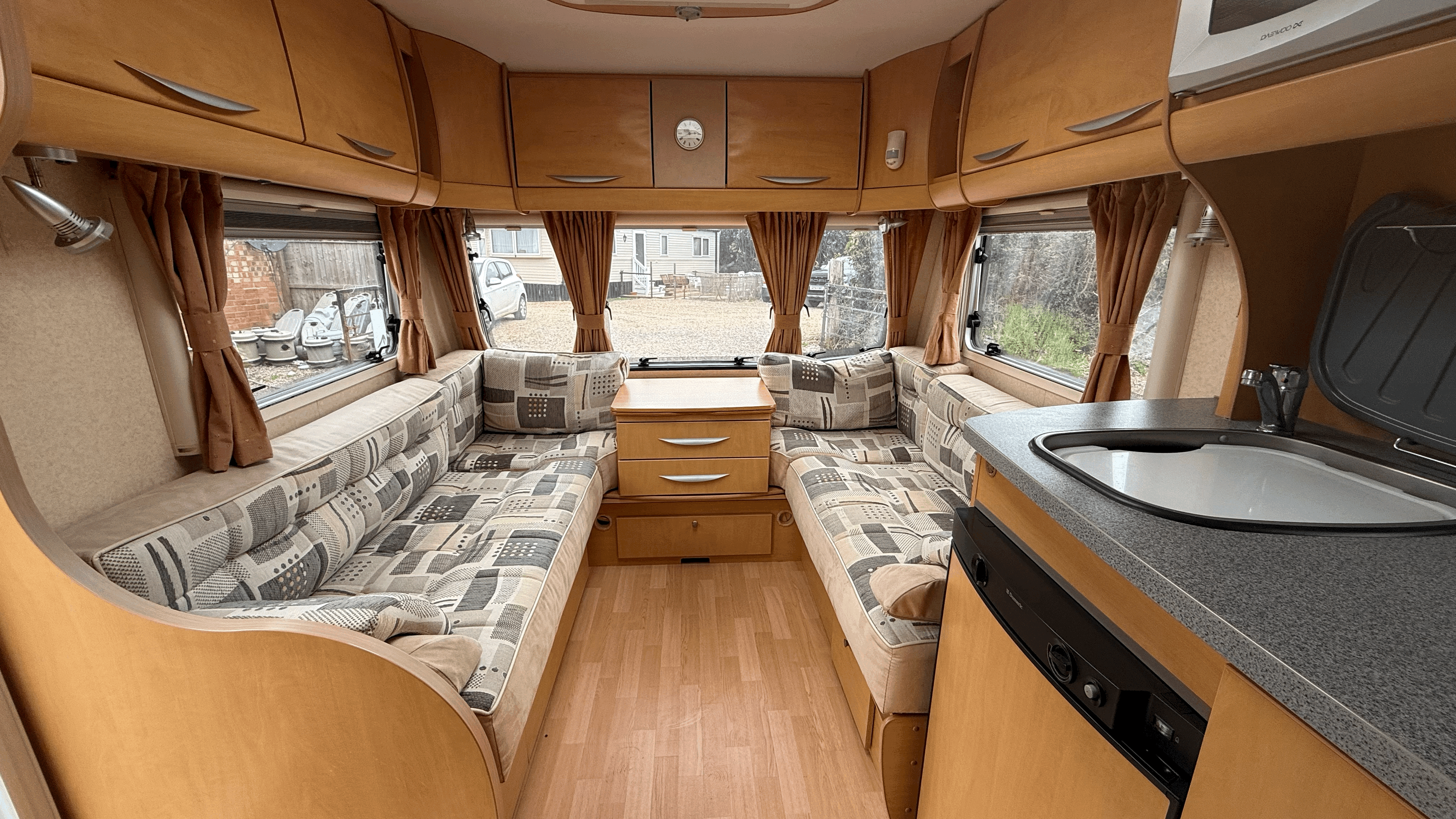 Large U-shaped seating that converts into a spacious double bed - Large front windows and rooflight for a bright, airy feel - Flyscreens and blackout blinds throughout - Overhead lockers and under-seat storage - Freestanding table for dining - TV point and aerial connection - Comfortable, supportive seating