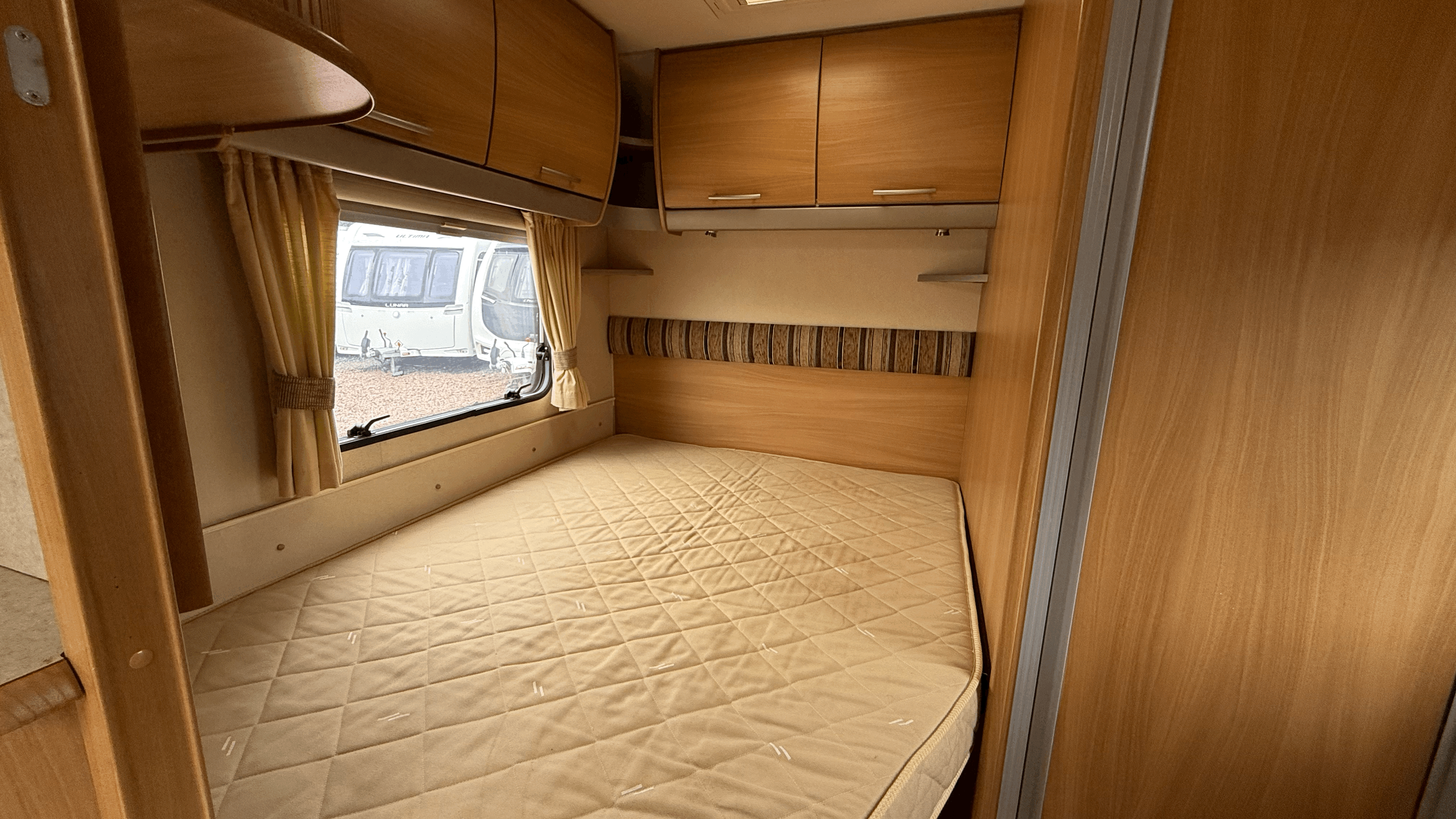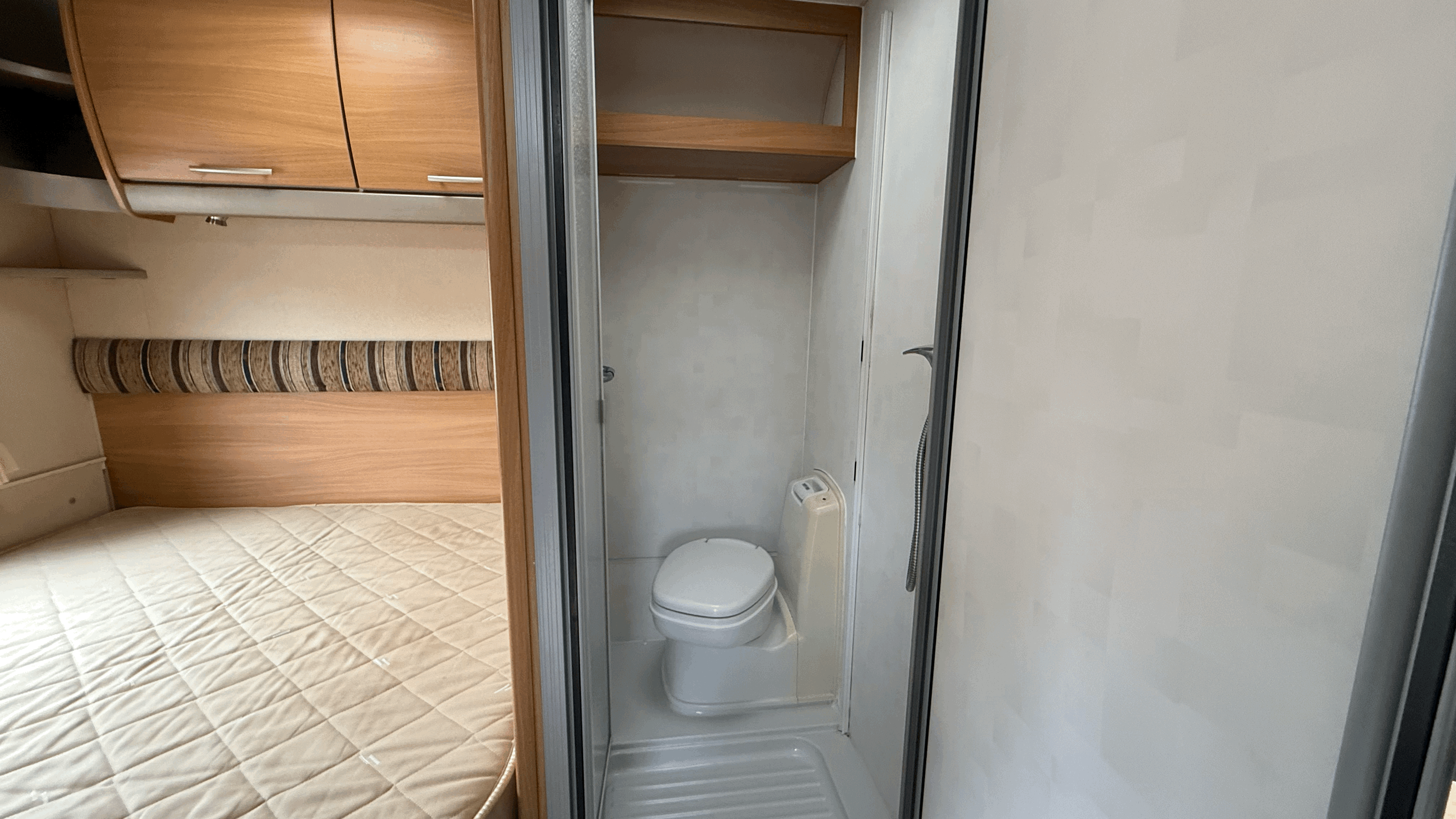 Fixed French double bed - Lift-up storage beneath with external access - Wardrobe storage nearby - Overhead lockers for additional storage - Privacy screen to separate sleeping area