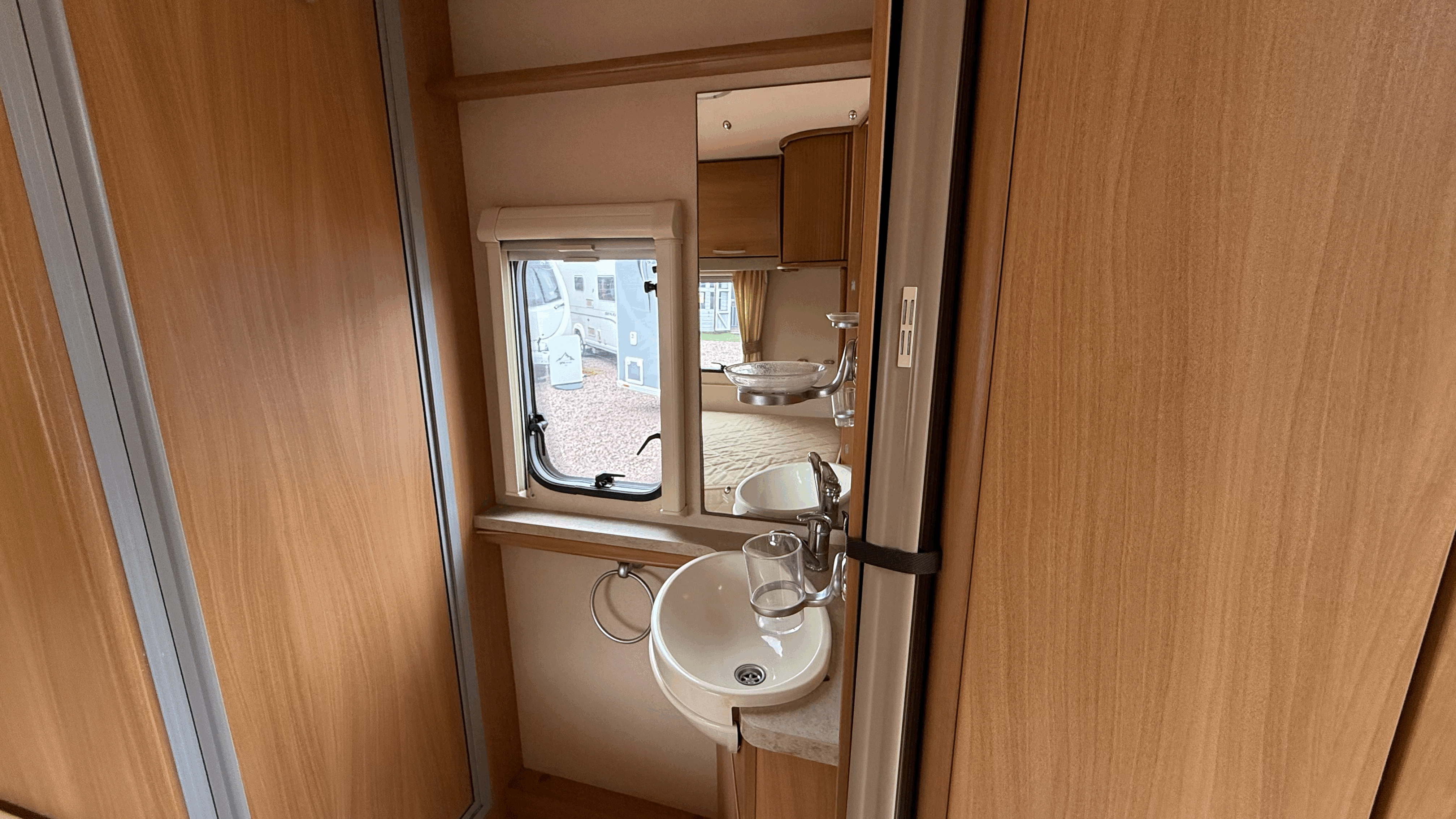 Full rear washroom - Separate shower cubicle - Thetford swivel cassette toilet - Hand basin with mixer tap and mirror - Vanity storage and cupboards - Roof vent for light and ventilation