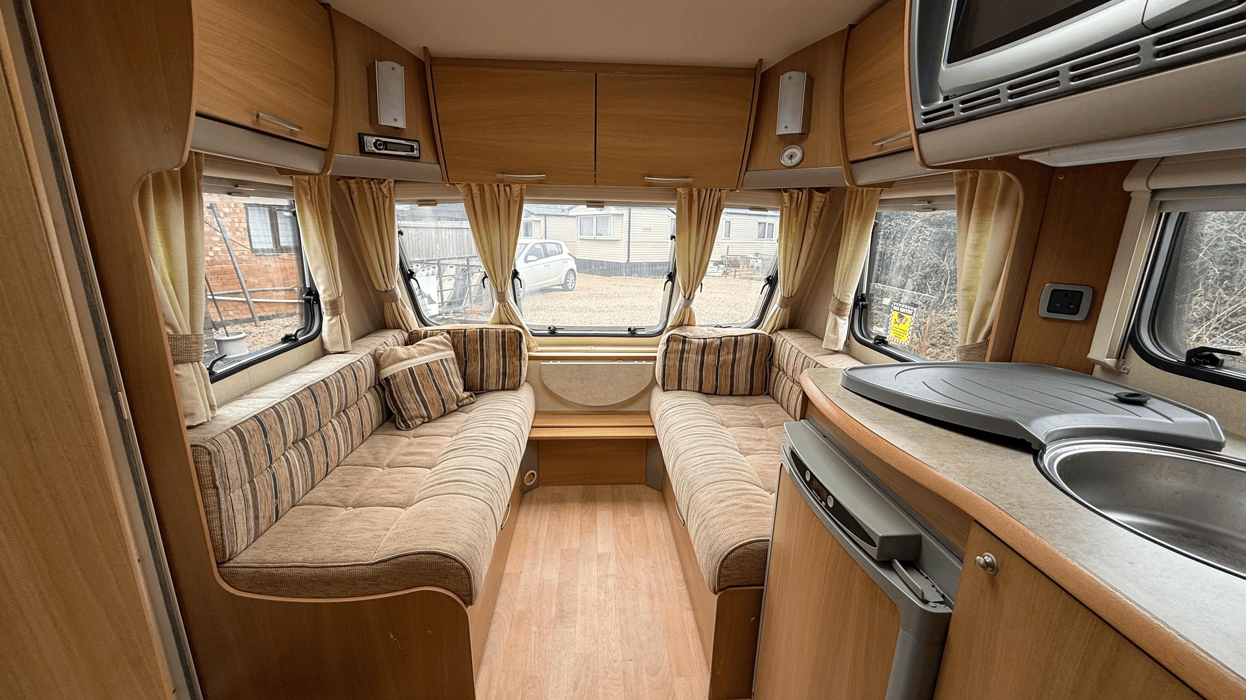 Spacious parallel seating that converts into a large double bed - Large front windows and Heki rooflight for a bright, airy feel - Flyscreens and blackout blinds throughout - Overhead lockers and under-seat storage - Freestanding table for dining - TV point and aerial connection - Well laid out, comfortable lounge space